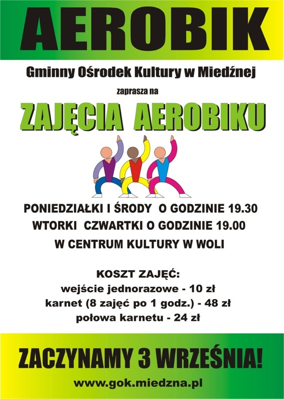 Kultura i rozrywka Aerobik 30 sierpnia 2012 0 FacebookTwitterPinterestWhatsApp Gminny Ośrodek Kultury w Miedźnej zaprasza na zajęcia aerobiku. Spotkania będą odbywaly się cztery razy w tygodniu w Centrum Kultury w Woli. Start juz 3 wrzesnia. There is no ads to display, Please add some
