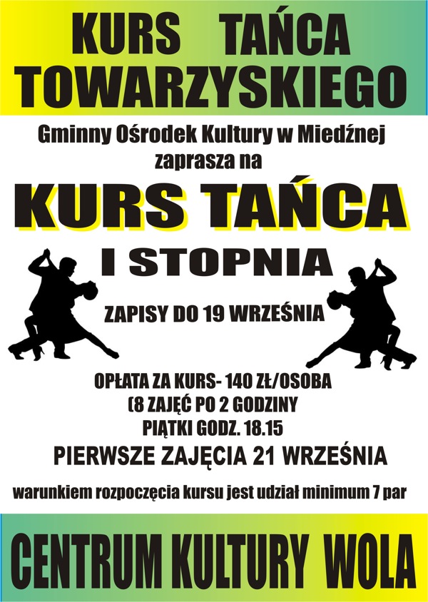 Kultura i rozrywkaMiedznaWola Kurs tańca 29 sierpnia 2012 0 FacebookTwitterPinterestWhatsApp Gminny Ośrodek Kultury w Miedźnej zaprasza na kurs tańca towarzyskiego I stopnia. Rozpoczecie kursu 21 wrzesnia natomiast zapisy do 19 wrzesnia koszt 140 zl osoba. There is no ads to display, Please add some