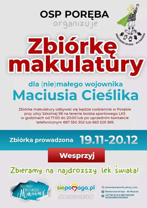 Zachęcamy też do wsparcia akcji nakrętki dla Maciusia które można wrzucać do serc w Woli ul. Pszczyńska, Góra serce pod Parafią i Miedźna obok boiska.