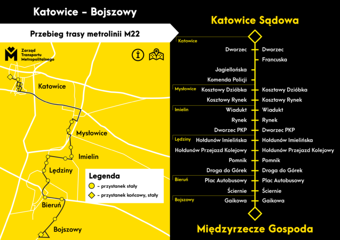 A szkoda, bo linia M22 ciekawa: dzisiaj są to 24 kursy, jedzie dość szybko – 70 minut z Międzyrzecza Gospody na dworzec w Katowicach, przez Mysłowice, Imielin, Lędziny, Bieruń – zatrzymuje się tylko na najważniejszych przystankach. Jeździ do późnych godzin nocnych, ostatni przyjazd do Międzyrzecza jest po północy, godz. 00:18.