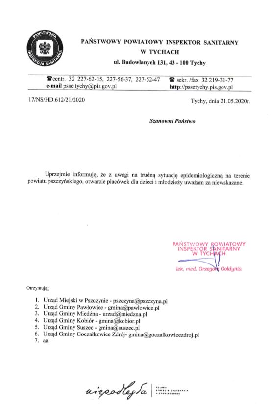 Mając na względzie trudną sytuację epidemiologiczną na terenie powiatu pszczyńskiego Państwowy Powiatowy Inspektor Sanitarny w Tychach lekarz medycyny Pan Grzegorz Gołdynia  poinformował, że otwarcie palcówek dla dzieci i młodzieży uważa za niewskazane.