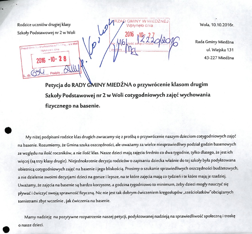 Pod koniec października wpłynęła kolejna petycja skierowana tym razem do Rady Gminy Miedźna, którą złożyli rodzice uczniów klasy drugiej Szkoły Podstawowej nr 2 w Woli.