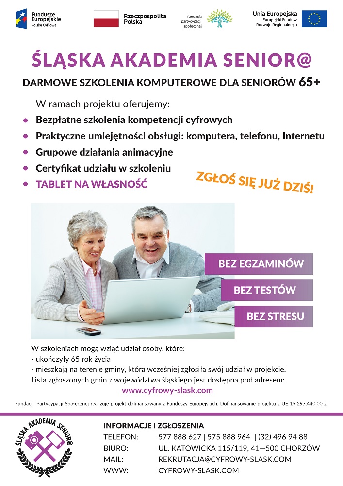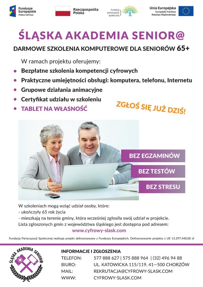 W trosce o bezpieczeństwo Seniorów, Fundacja Partycypacji Społecznej w ramach projektu Śląska Akademia Senior@ wprowadziła możliwość odbywania szkoleń zdalnych (on-line), wychodząc tym samym naprzeciw sytuacji związanej z pandemią koronawirusa SARS-CoV-2 i koniecznością pozostawania Seniorów w domach.