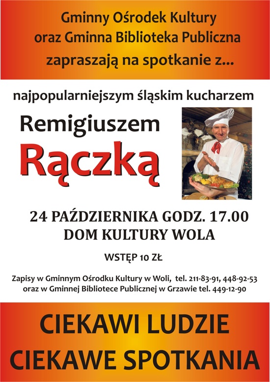 W ramach cyklu spotkań Ciekawi Ludzie… Ciekawe Spotkania, Gminny Ośrodek Kultury oraz Gminna Biblioteka Publiczna serdecznie zapraszają na spotkanie z Remigiuszem Rączką – najpopularniejszym śląskim kucharzem.