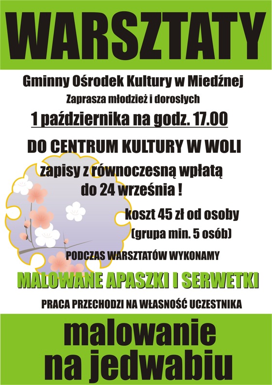 Kultura i rozrywka Warsztaty malowania na jedwabiu 7 września 2012 0 FacebookTwitterPinterestWhatsApp Gminny Ośrodek Kultury w Miedźnej zaprasza na warsztaty malowania na jedwabiu, podczas zajęć będzie malowana apaszka oraz serwetka.Zapisy i wpłata 45zł do 24 września. Zapraszamy There is no ads to display, Please add some