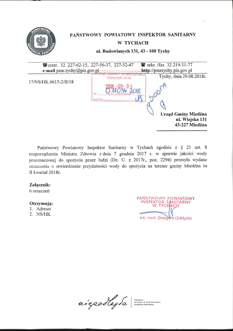 Państwowy Powiatowy Inspektor Sanitarny w Tychach wydał orzeczenia dotyczące przydatności wody do spożycia na terenie Gminy Miedźna za II kwartał 2018r.