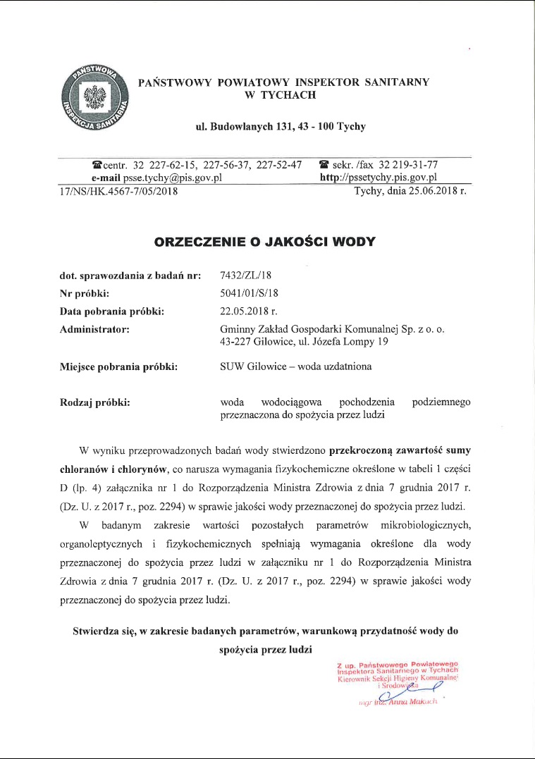 Niestety jak się okazało próbka wody uzdatnionej pobrana w Stacji Uzdatniania Wody w Gilowicach zawierała przekroczoną zawartość chloranów i chlorynów.