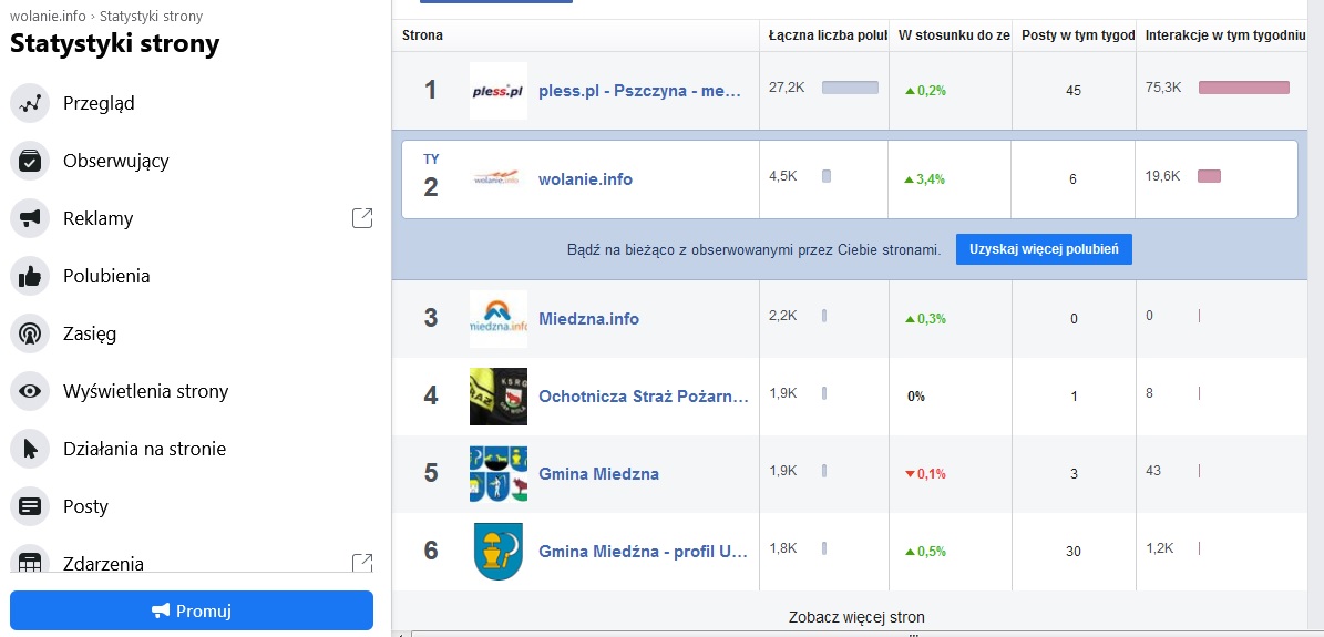 W ostatnim tygodniu w mediach społecznościowych profil Facebook odwiedziło(przy 6 postach) ponad 19tyś. czytników co klasyfikuje nas w ścisłej czołówce Powiatu Pszczyńskiego oraz lidera gminy Miedźna.